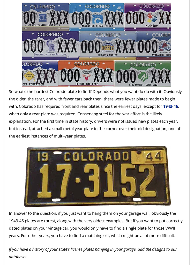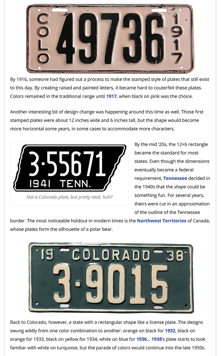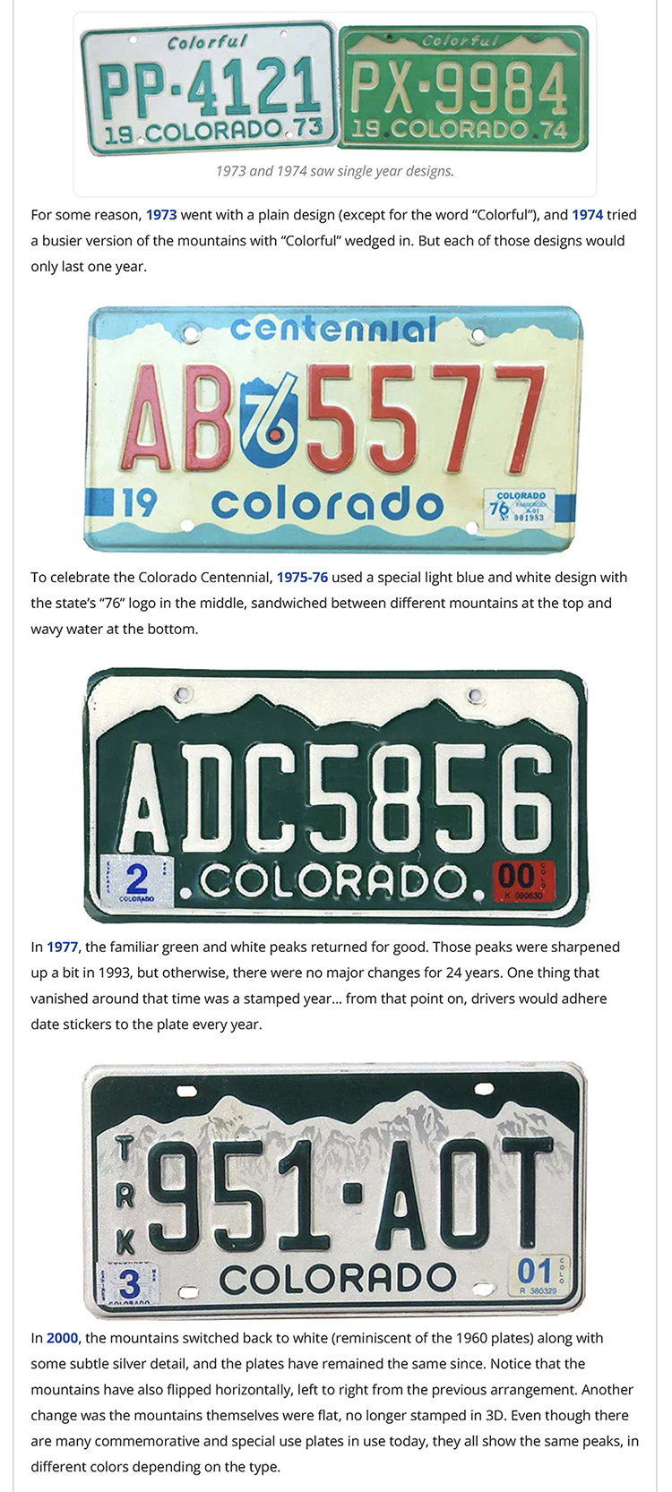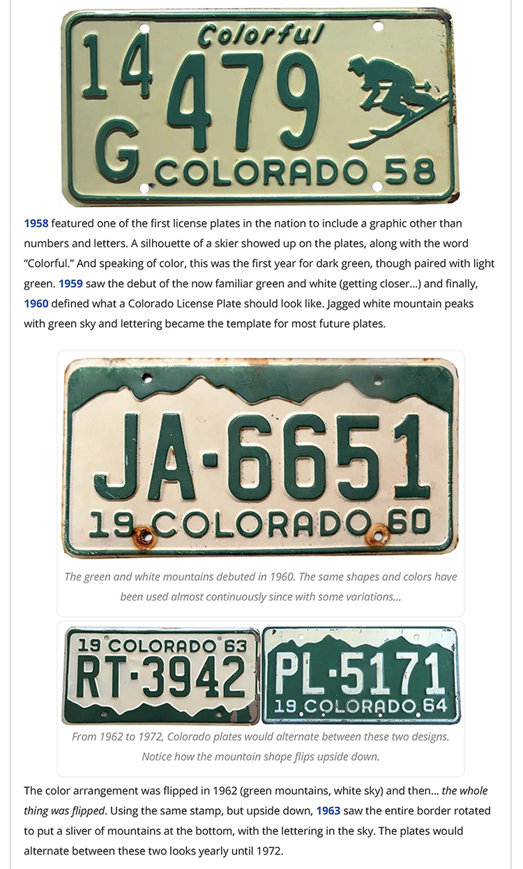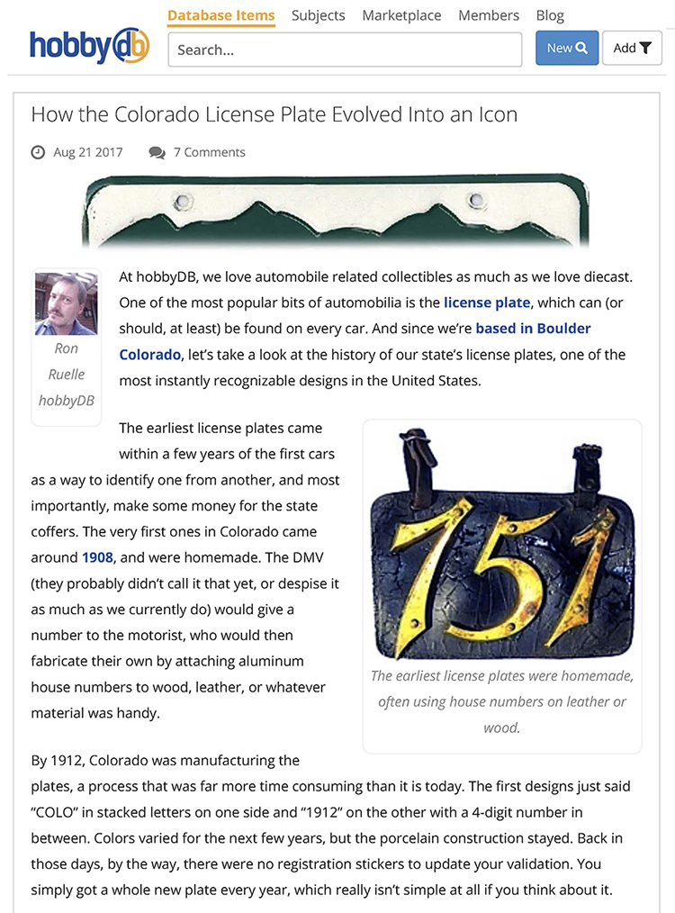 Ron Ruelle wrote this history of the Colorado license plate for hobbyDB, a website about toys, collecting, geek culture, and other fun stuff. He writes about toy cars, action figures, comic books, science fiction and other pop culture topics. Kind of a dream job, really. (Please note: This article is an archived version. You can see the original here.)