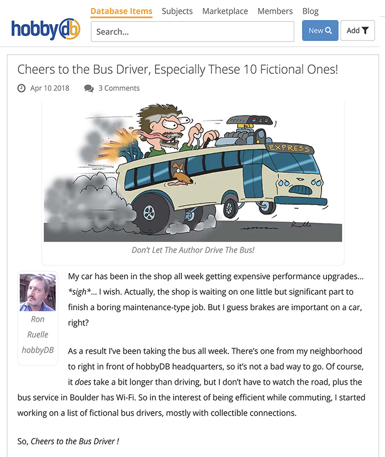 Ron Ruelle actually wrote this column while riding the bus to work for a week for hobbyDB, a website about toys, collecting, geek culture, and other fun stuff. He writes about toy cars, action figures, comic books, science fiction and other pop culture topics. Kind of a dream job, really. (Please note: This article is an archived version. You can see the original here.)