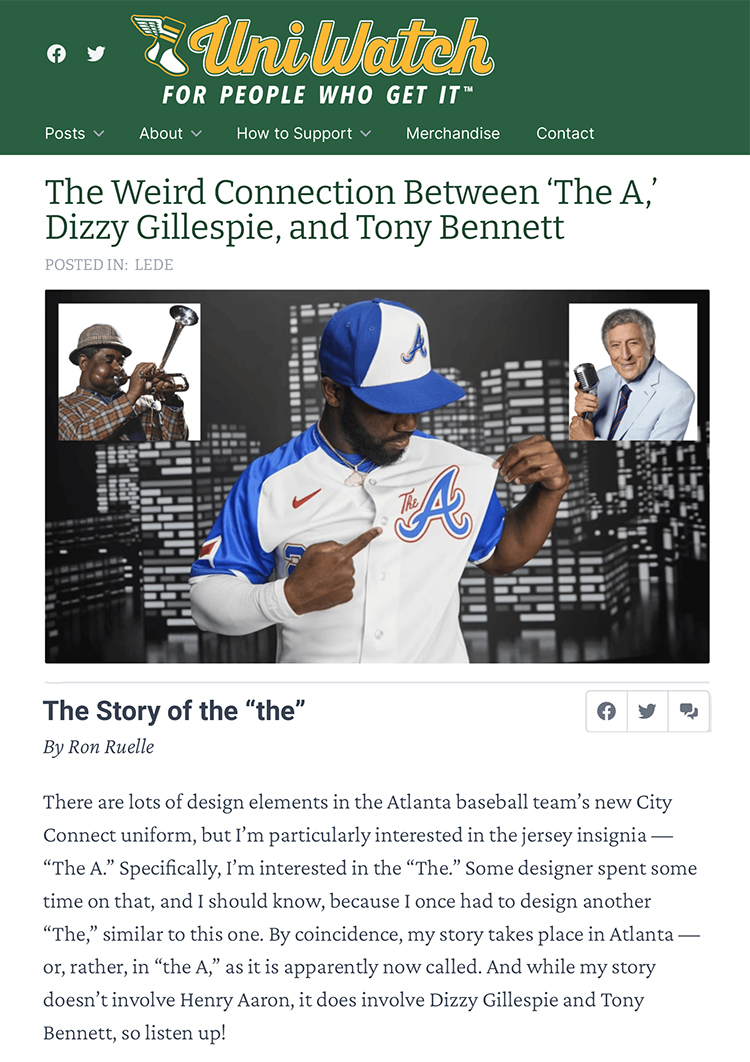 Ron Ruelle wrote this article about the Atlanta baseball team's new City Connect uniforms for Uni-Watch a website about sports uniforms, as well as other uniforms and other aesthetic aspects of the games. The strange logo referring to Atlanta as "The A" reminded him of another project about another "the" that also happend in Atlanta. (Please note: This article is an archived version. You can see the original here.)